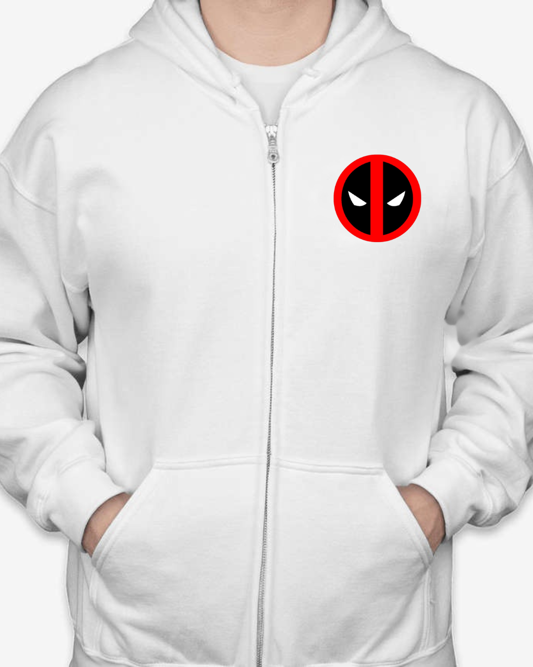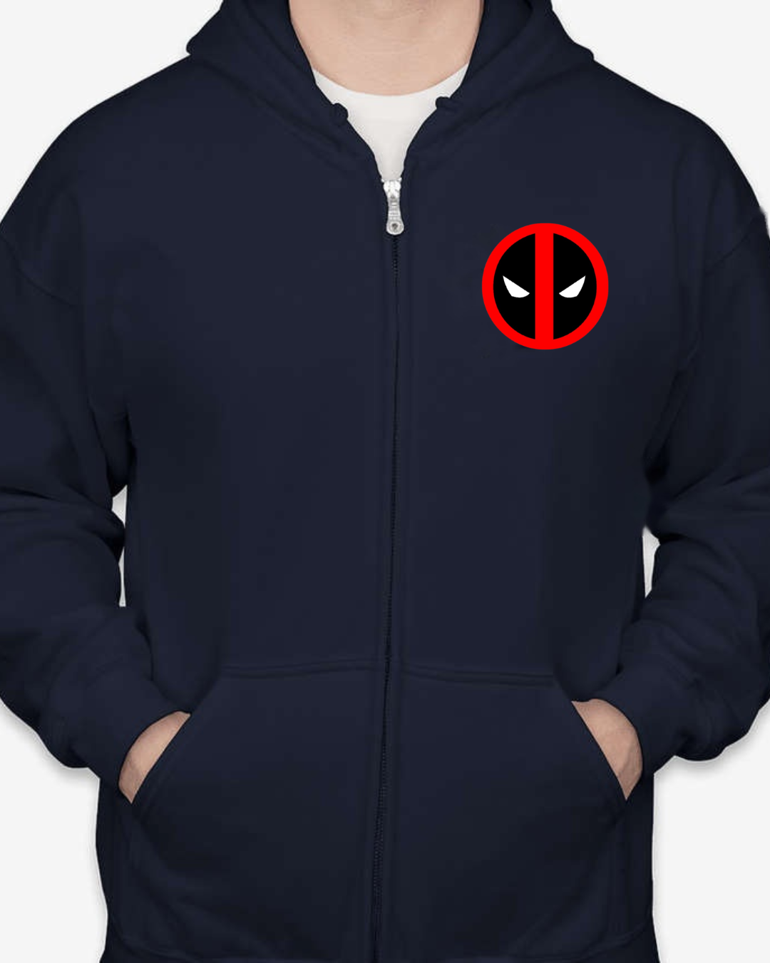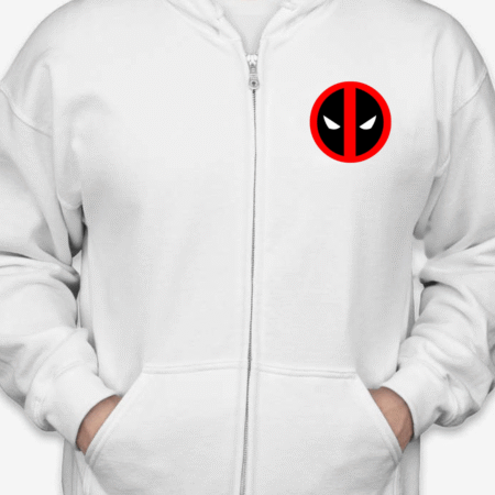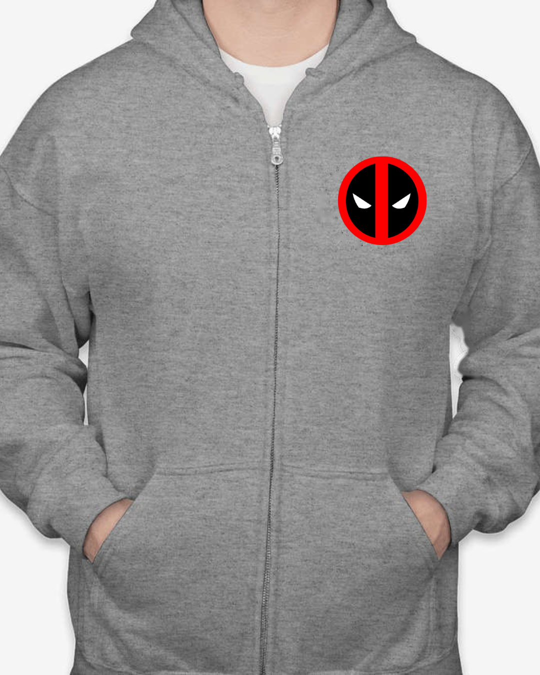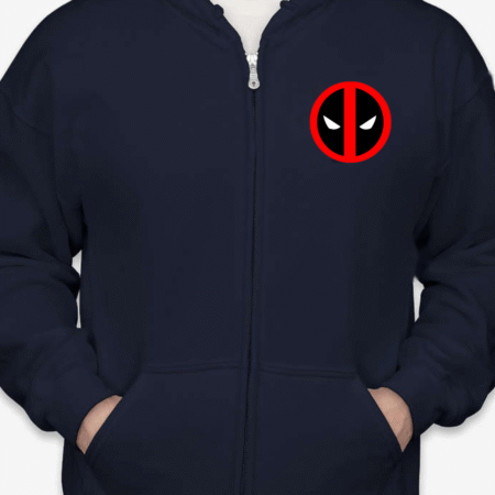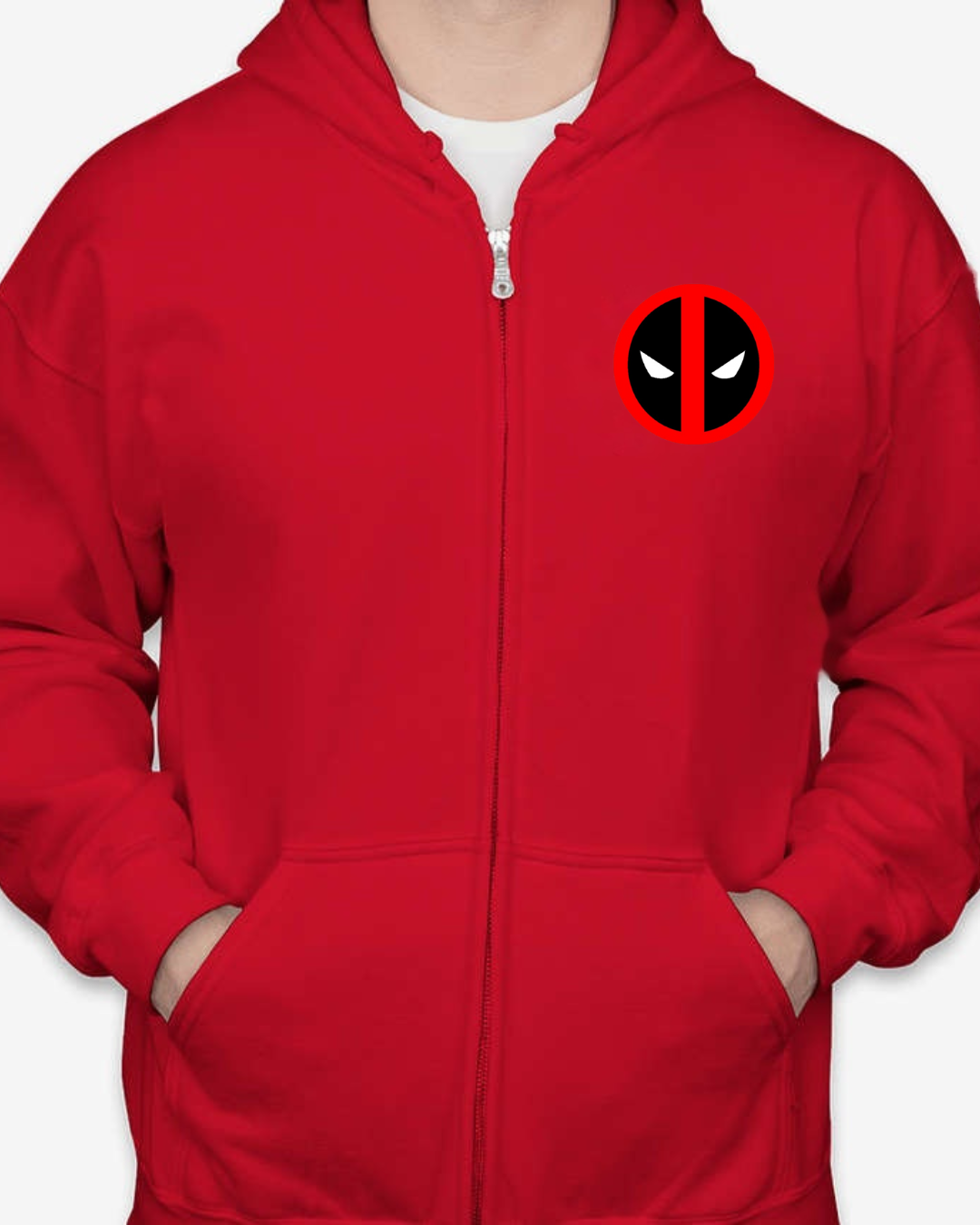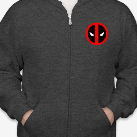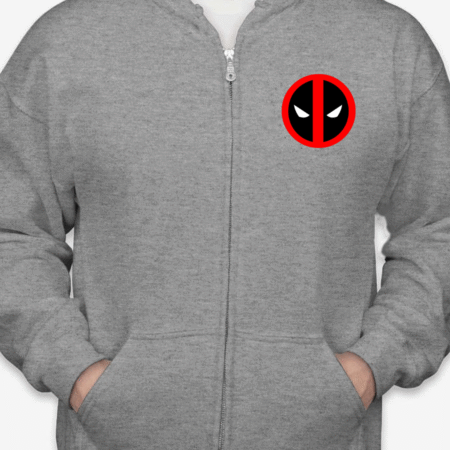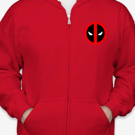 Add bold comic-inspired style to your everyday wardrobe with this Deadpool logo inspired zip-up hoodie. Featuring a striking front chest emblem inspired by the iconic Deadpool mask design, this hoodie delivers a clean, edgy streetwear look perfect for fans of superhero culture.