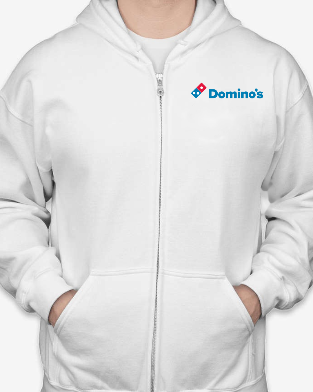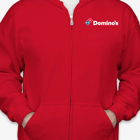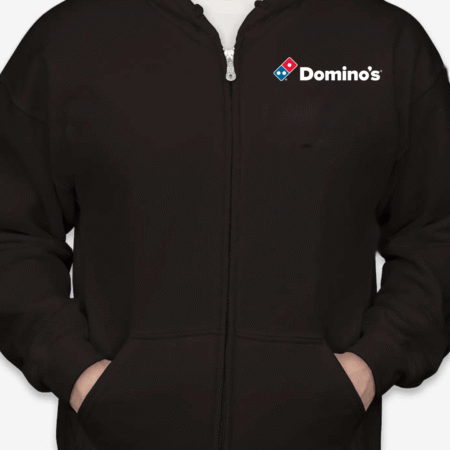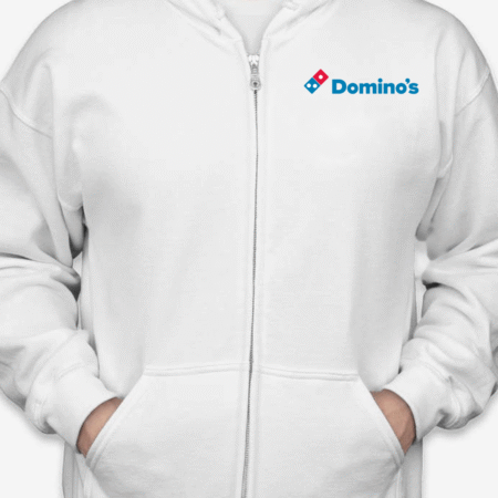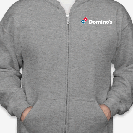 Keep your look simple and casual with this Domino’s logo inspired zip-up hoodie. Featuring a clean front chest design inspired by the recognizable Domino’s branding, this hoodie delivers a modern, everyday streetwear vibe that’s perfect for relaxed wear.