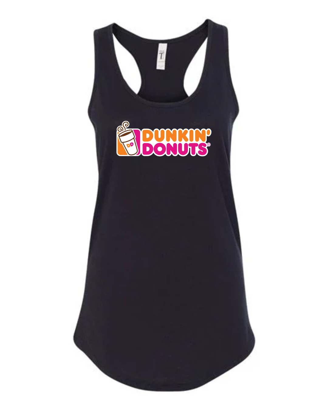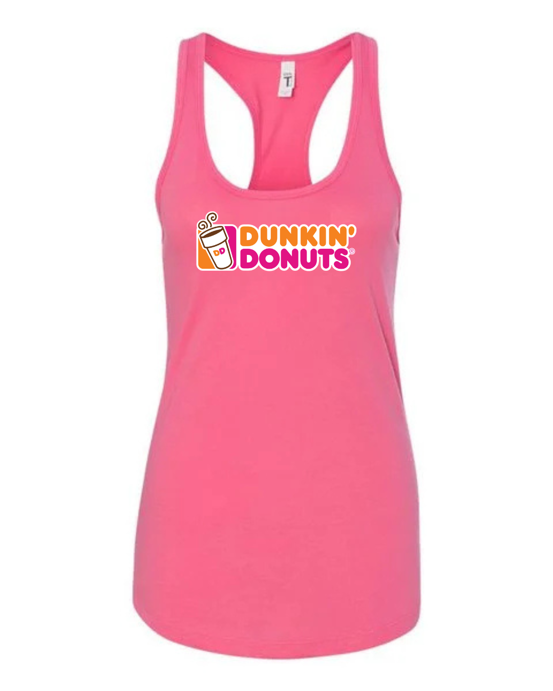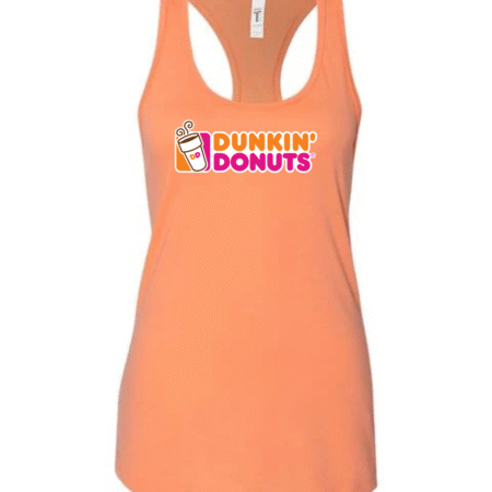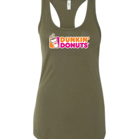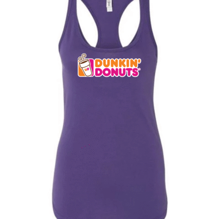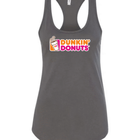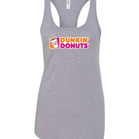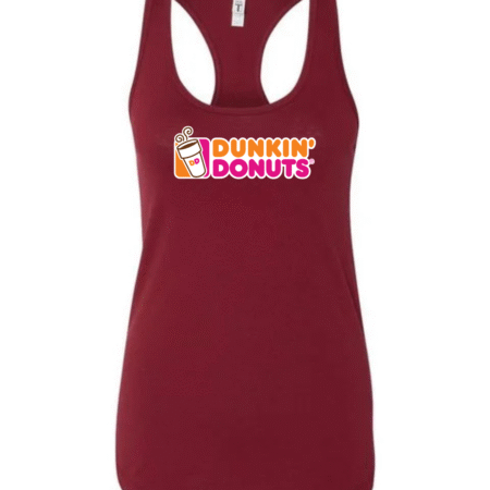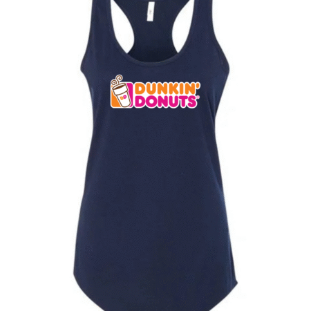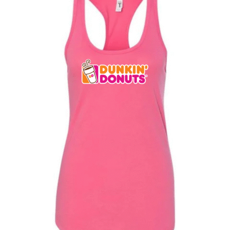 Start your day in style with this Dunkin’ Donuts inspired women’s racerback tank top. Featuring a fun, coffee-and-donut–style logo printed on the front, this tank brings bright energy and casual comfort to your everyday look.