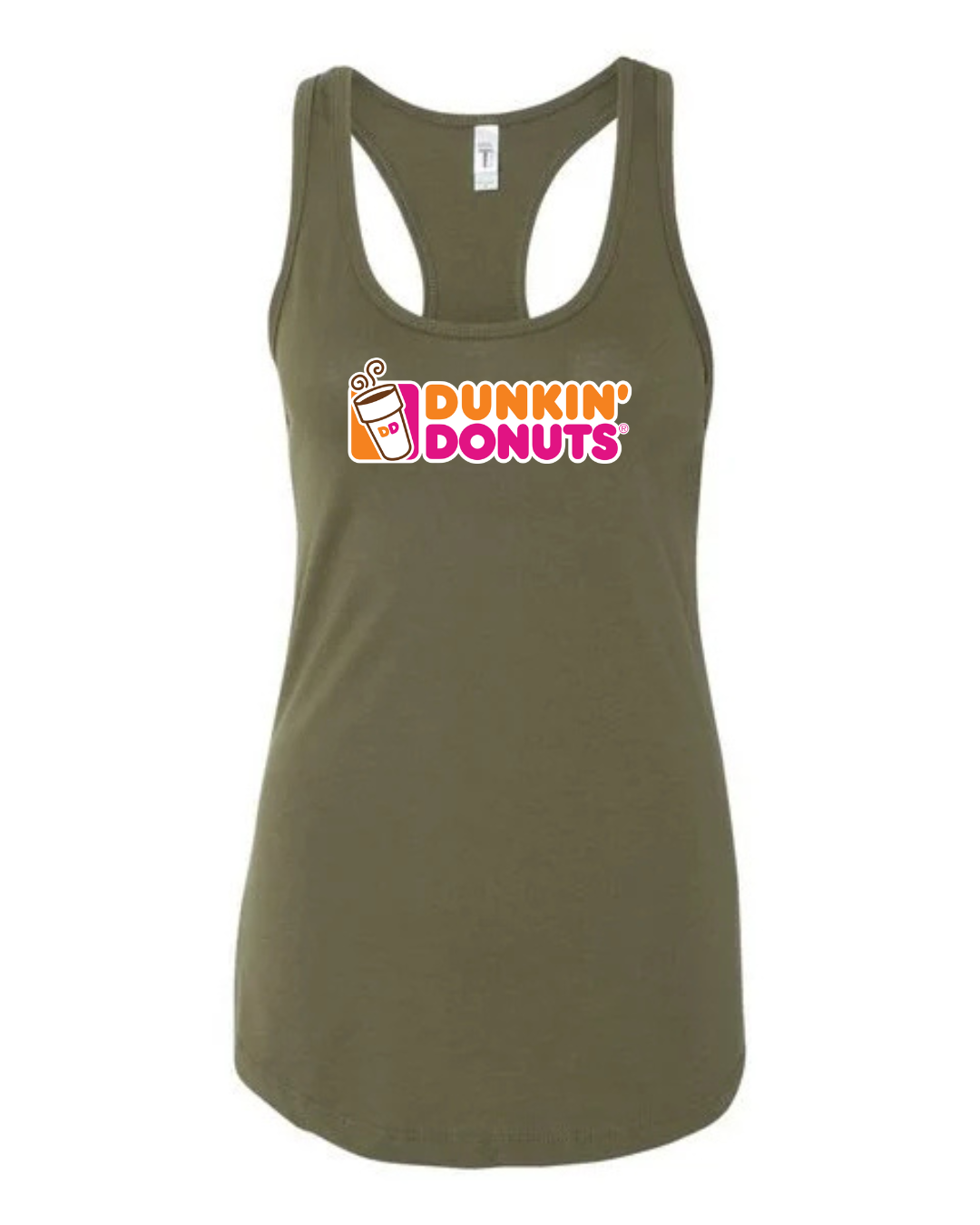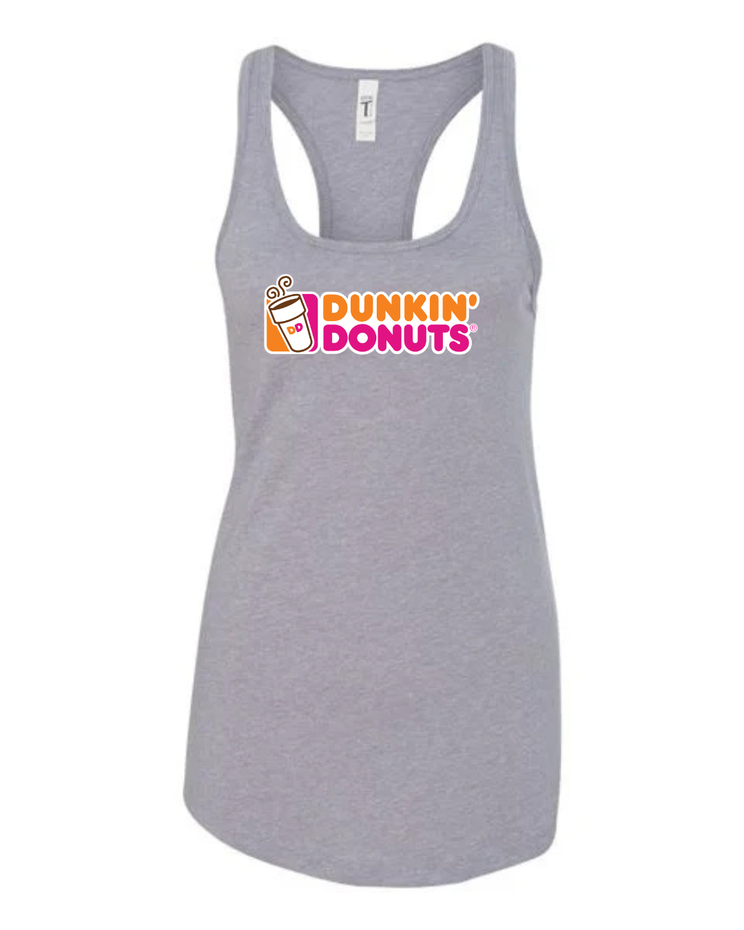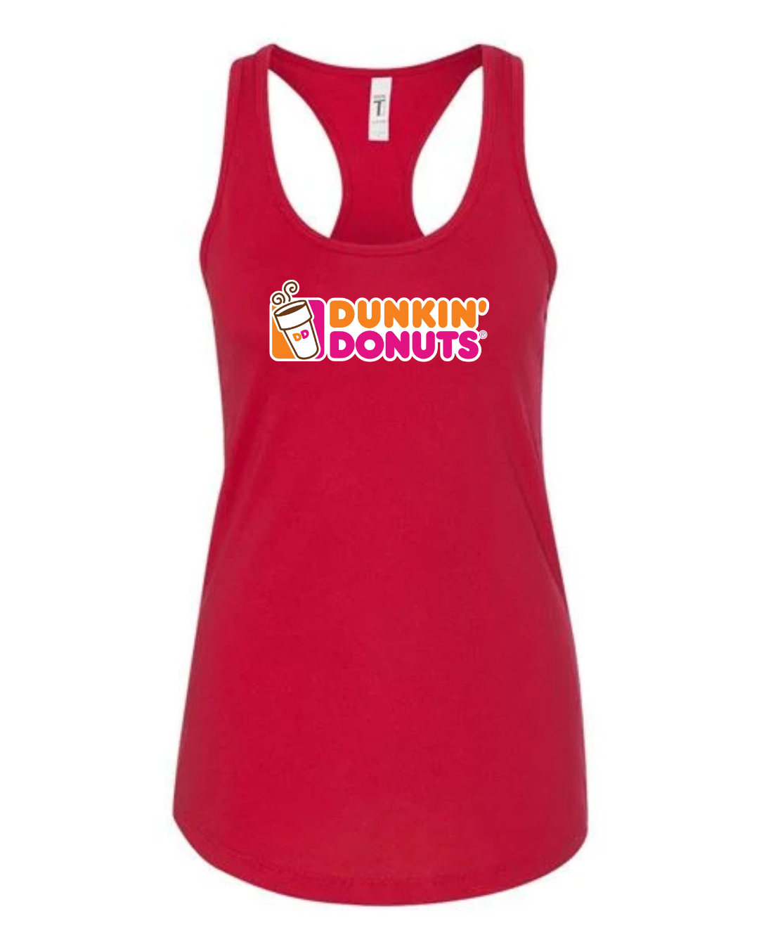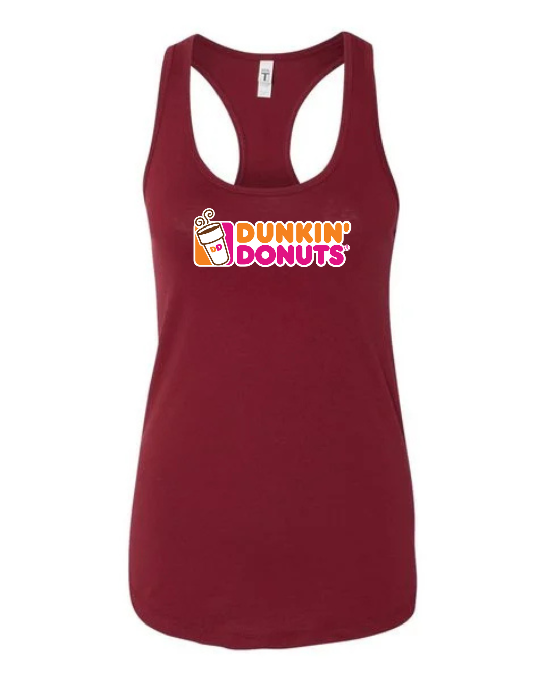 Start your day in style with this Dunkin’ Donuts inspired women’s racerback tank top. Featuring a fun, coffee-and-donut–style logo printed on the front, this tank brings bright energy and casual comfort to your everyday look.