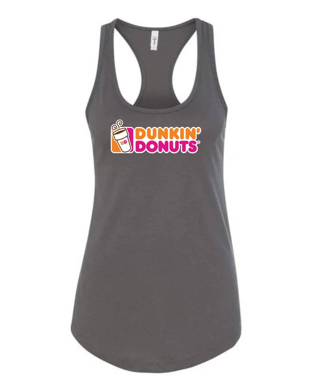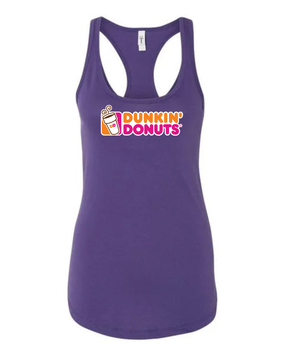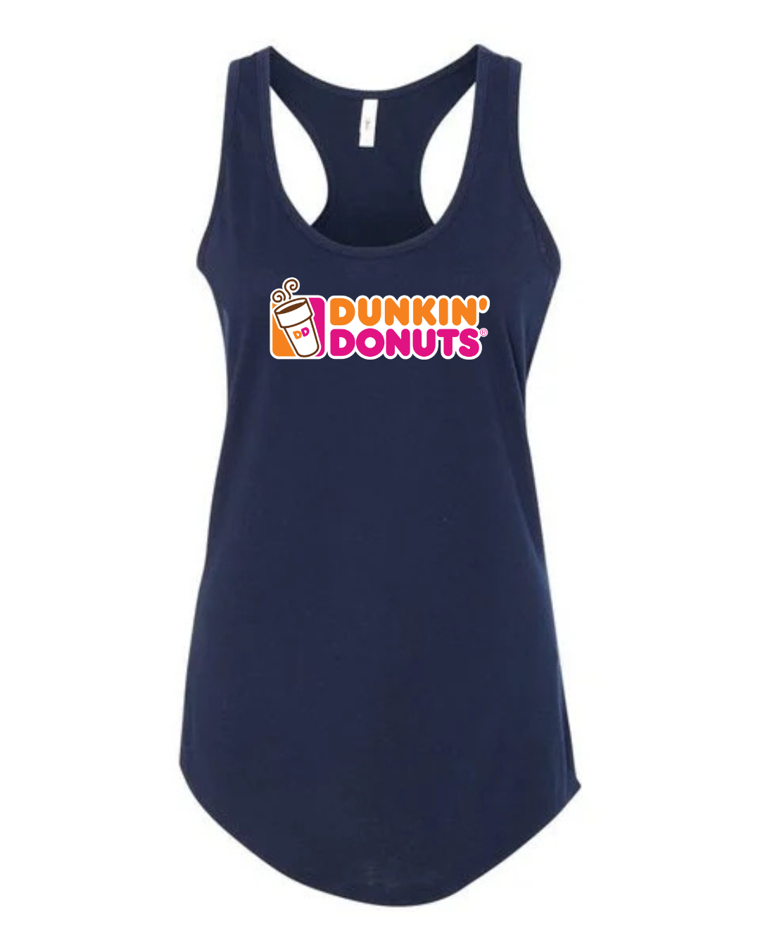 Start your day in style with this Dunkin’ Donuts inspired women’s racerback tank top. Featuring a fun, coffee-and-donut–style logo printed on the front, this tank brings bright energy and casual comfort to your everyday look.
