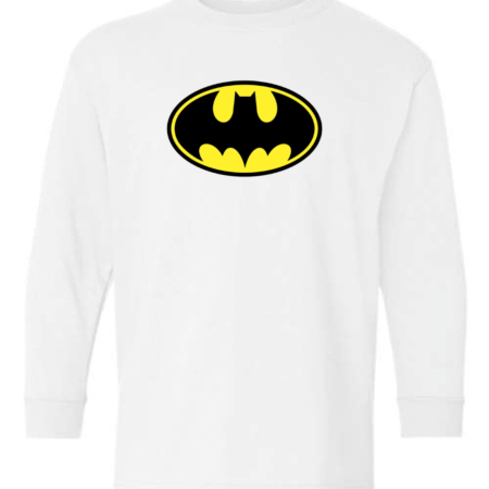 Perfect for young superheroes in training, this youth Batman logo long sleeve shirt features the iconic yellow-and-black Bat symbol on the front for a bold, instantly recognizable look. Clean, powerful, and timeless, this long sleeve tee is ideal for kids who love superheroes and action-packed style.